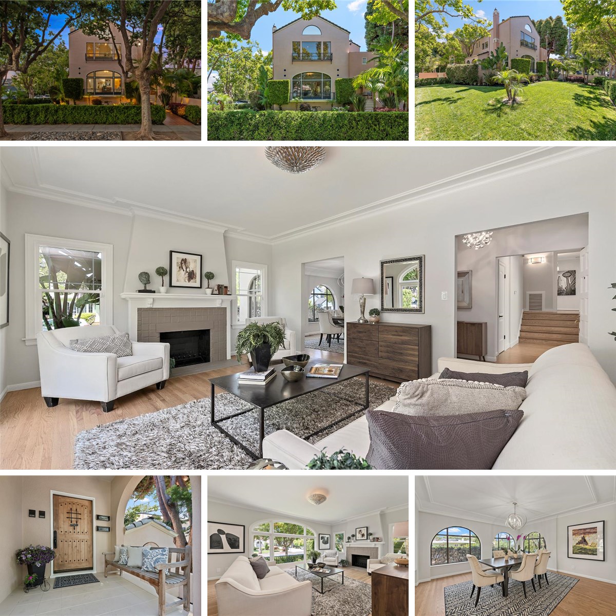 The main residence features arched windows, an open and bright living room with a tiled wood-burning fireplace, a spacious dining room, an eat-in kitchen, and a half bath. All three bedrooms are on the same level, with two full bathrooms, including a generous primary suite with dual sinks and a separate tub and shower, plus two spacious secondary bedrooms—one with its own private balcony. The large family room off the kitchen includes a fireplace, laundry area, and a sliding glass door that opens to an expansive backyard bordered by palm trees.